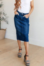 Get ready to rock your denim look with the Marcy High Rise Denim Midi Skirt from Judy Blue! With a flattering high rise fit and a versatile dark wash, this skirt is perfect for any occasion. The 4-way stretch and back vent provide a comfortable and stylish fit, while the raw hem adds a touch of edge. Say goodbye to ill-fitting skirts and hello to the perfect fit!