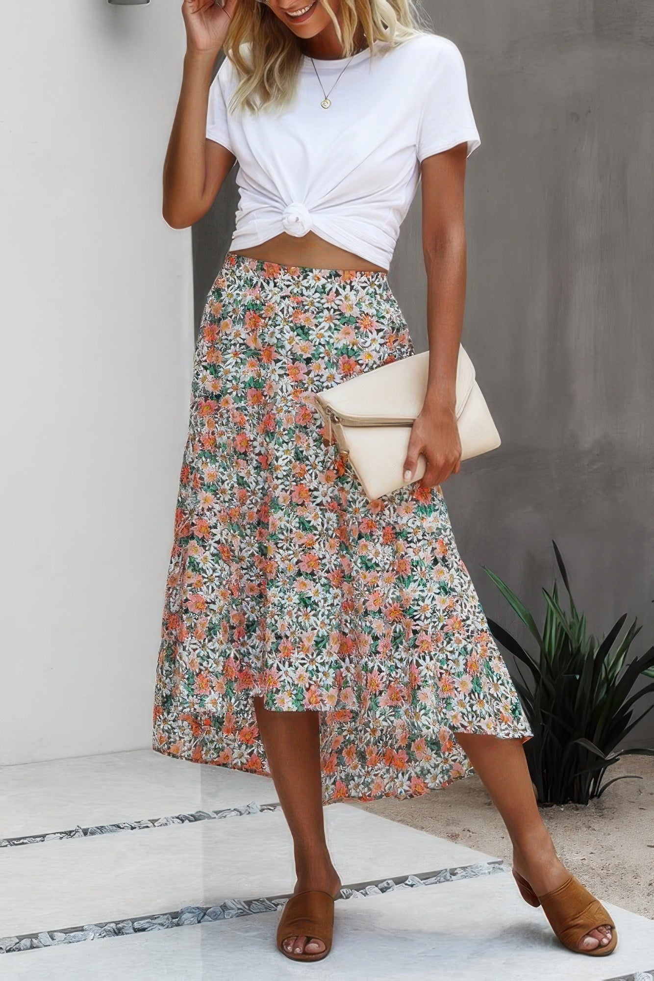 Floral Print High Waist Skirt A Line Long Skirt - Beige / S is backordered and will ship as soon as it is back in stock.