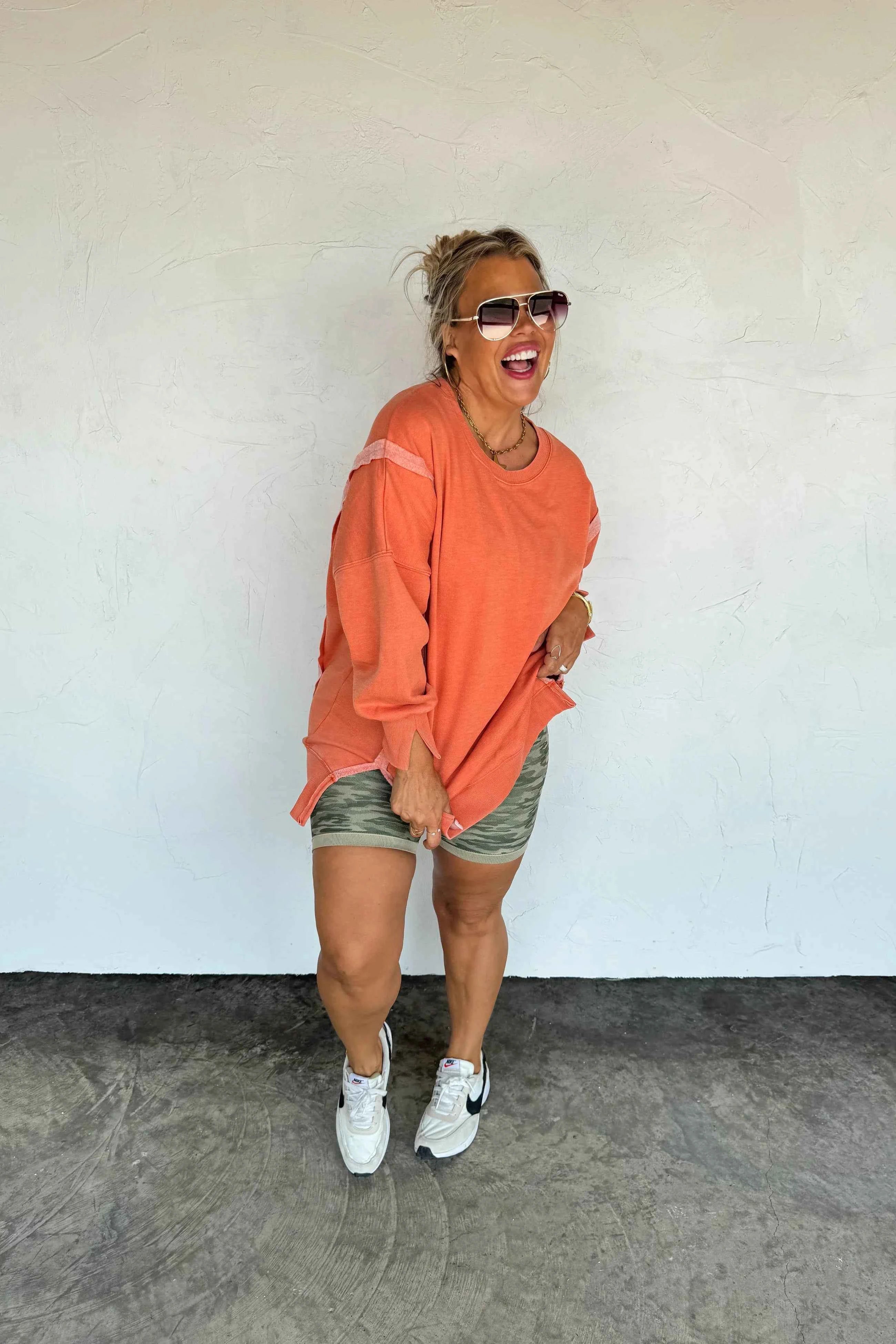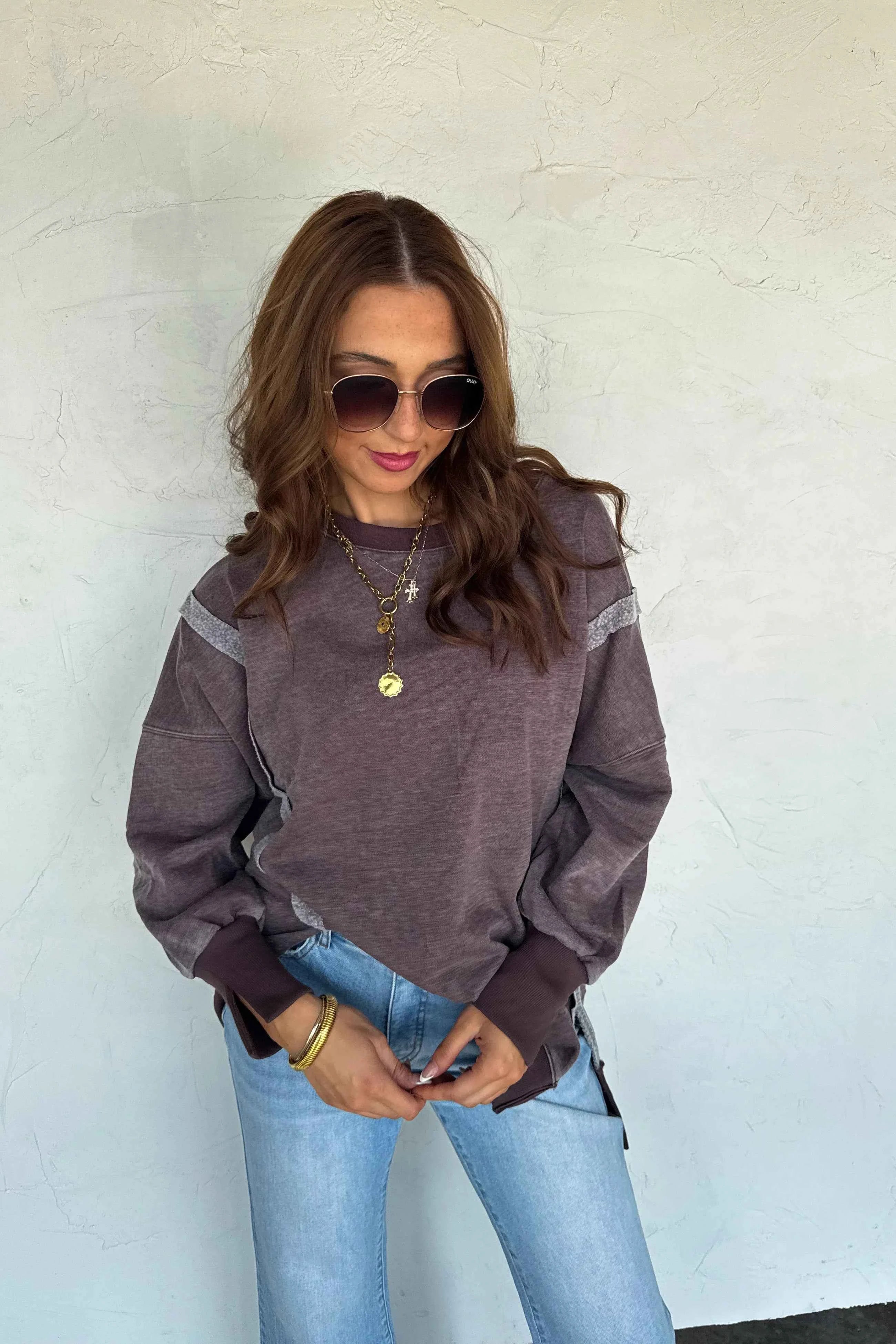 We spared no attention to detail in our new mineral washed sweatshirt! This forever timeless pullover is a slouchy, relaxed fit with exposed seaming, cute split cuff hem and ribbed trim detail! Has super soft "sweatshirt" feel on the inside!