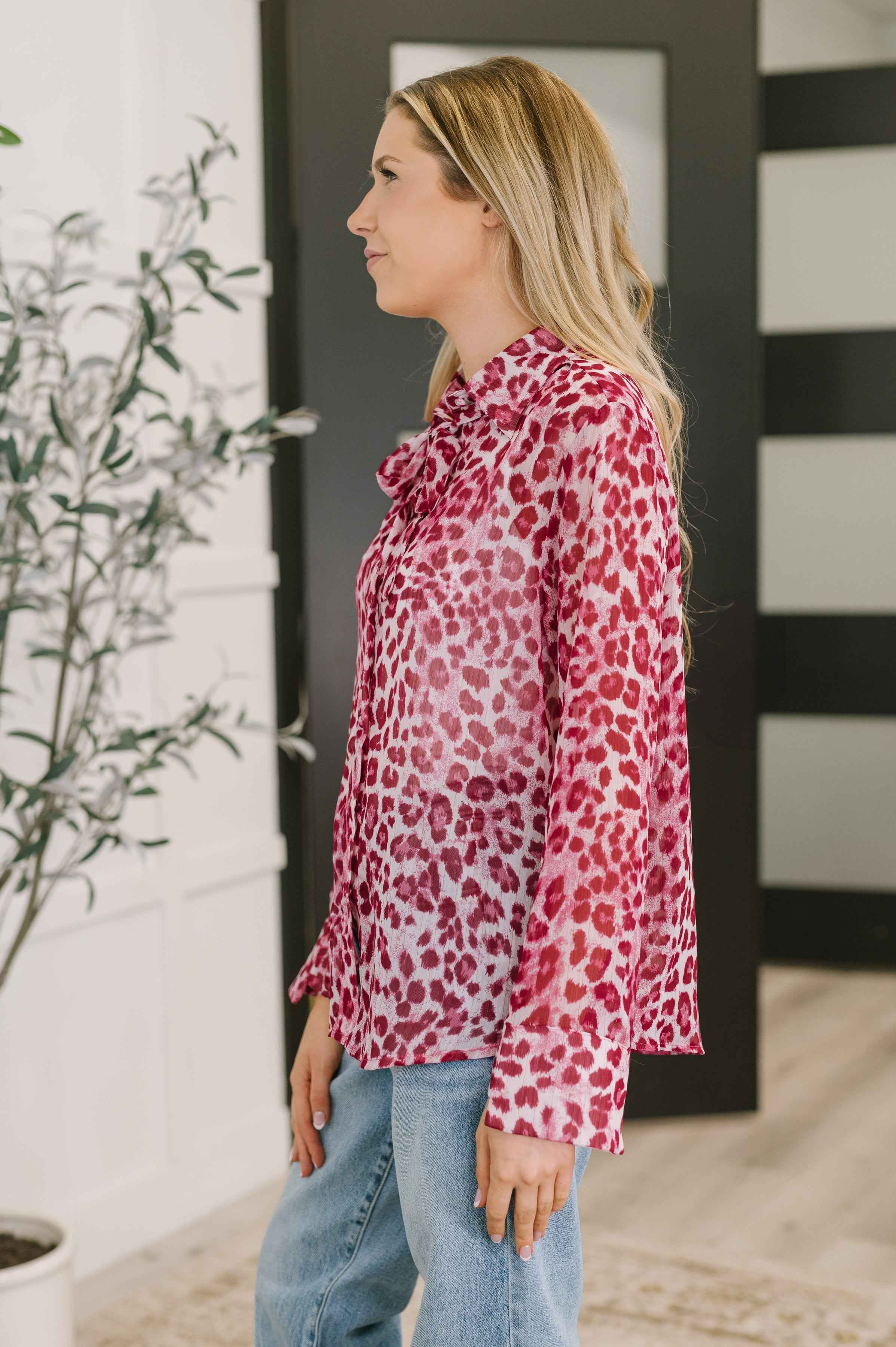 The Totally Not Dramatic Leopard Print Button Down in Hot Pink is here to turn heads and steal the spotlight. This sheer chiffon beauty features a crisp collared neck with a functional tie that lets you play with your look—cinch it tight or let it flow loose. The full front button-down design gives you total control, while the scooped hem and stepped sleeve cuffs add unexpected flair. Perfect for layering over a slip or rocking solo when you're feeling bold and ready to make a statement.