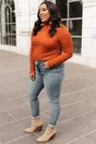 Spice up your style with this rust colored turtleneck top with ruched detailing along the neckline! A touch of stretch that hugs your body in all the right places. Fitted long sleeves and form fitting body throughout, it's the ultimate layering shirt to add a pop of color to your closet!