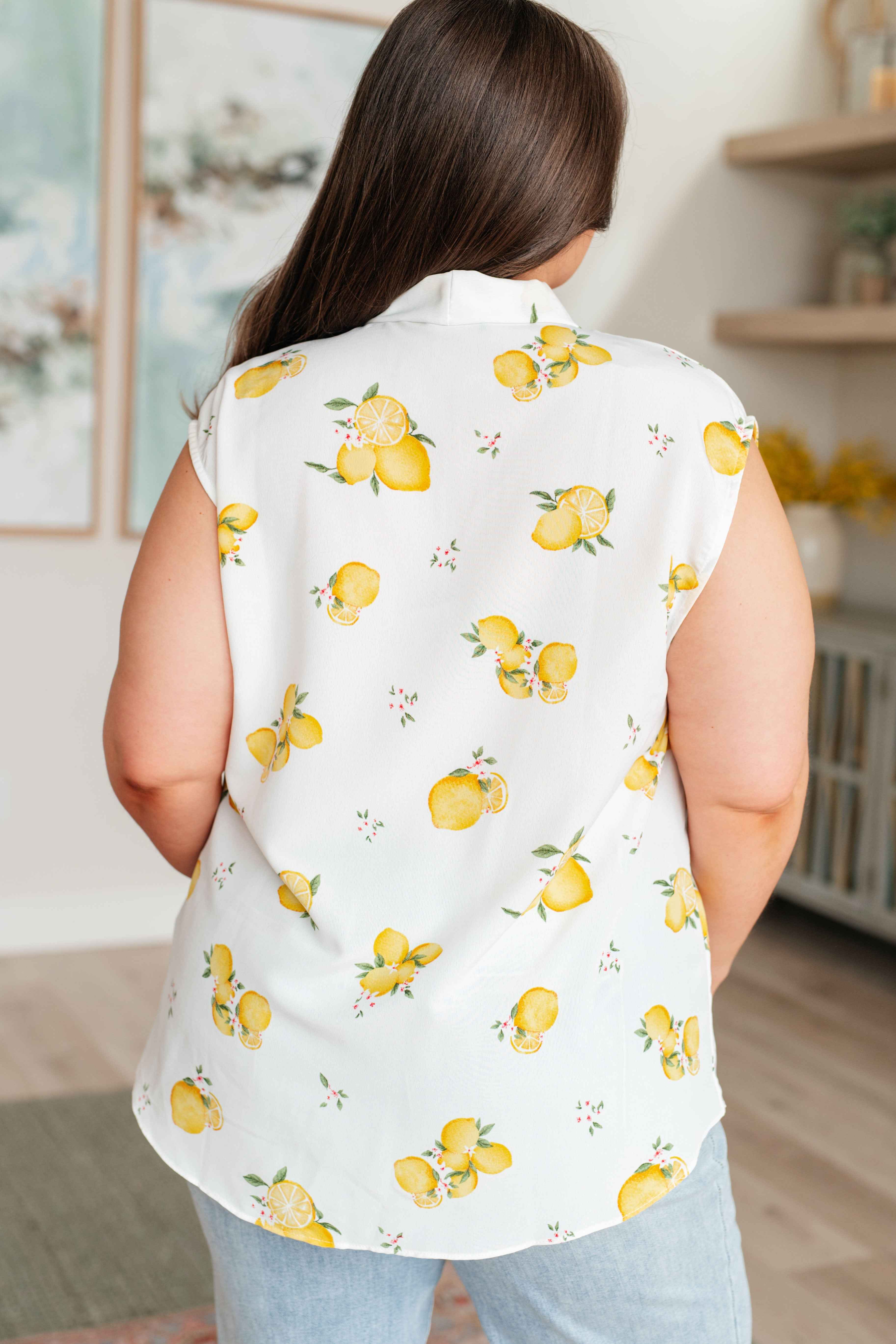¡Prepárate para aprovechar al máximo el día con nuestra blusa sin mangas When Life Gives You Lemons! Esta divertida prenda presenta un tejido, cuello chal y un bajo asimétrico. Perfecta para añadir un toque de fantasía a cualquier look, ya sea para trabajar o para disfrutar.