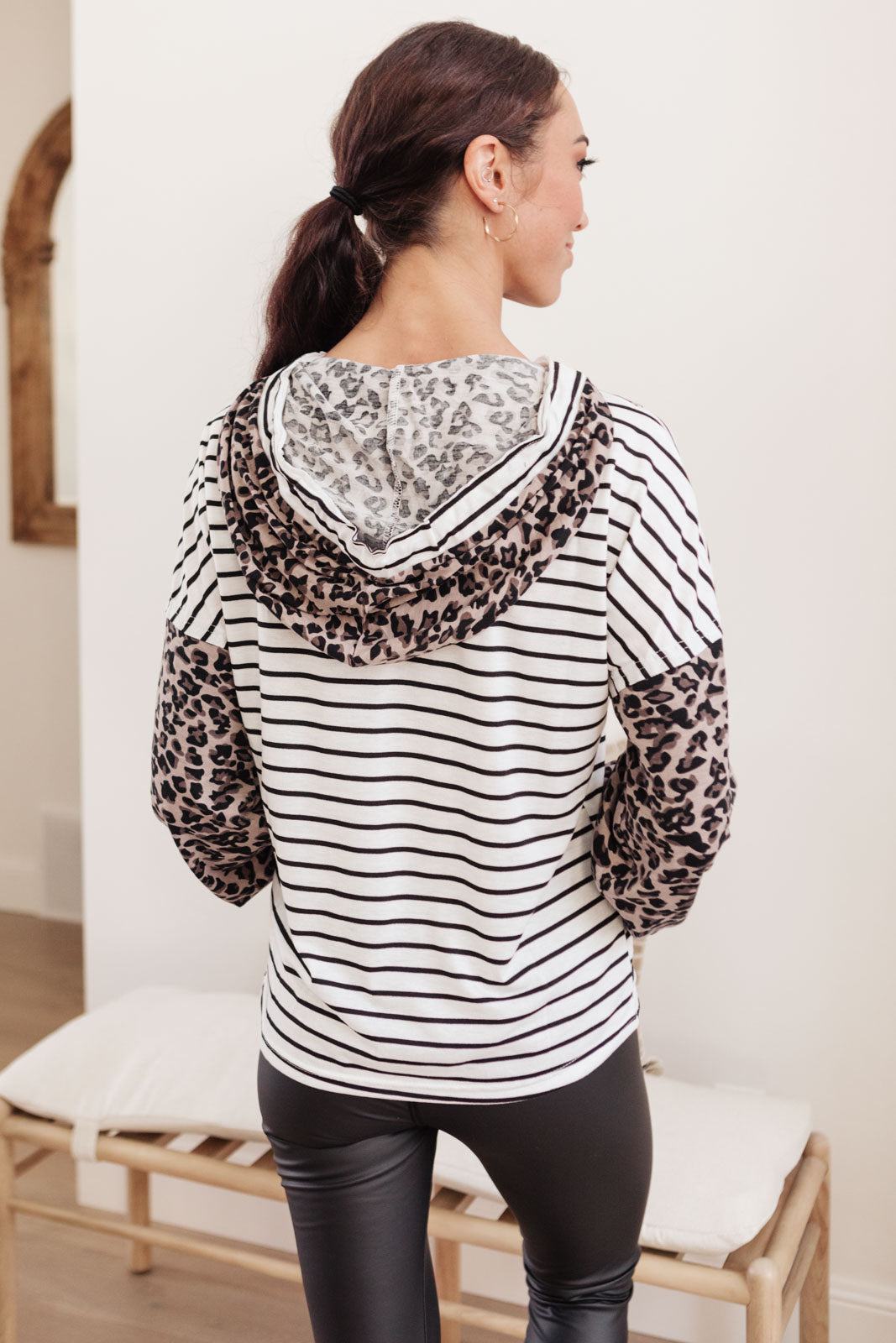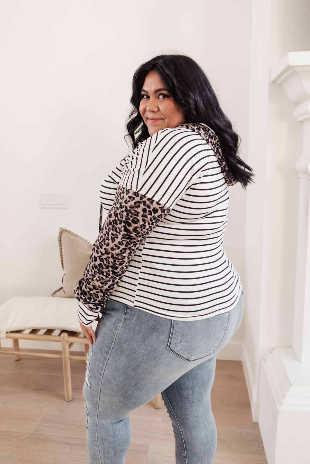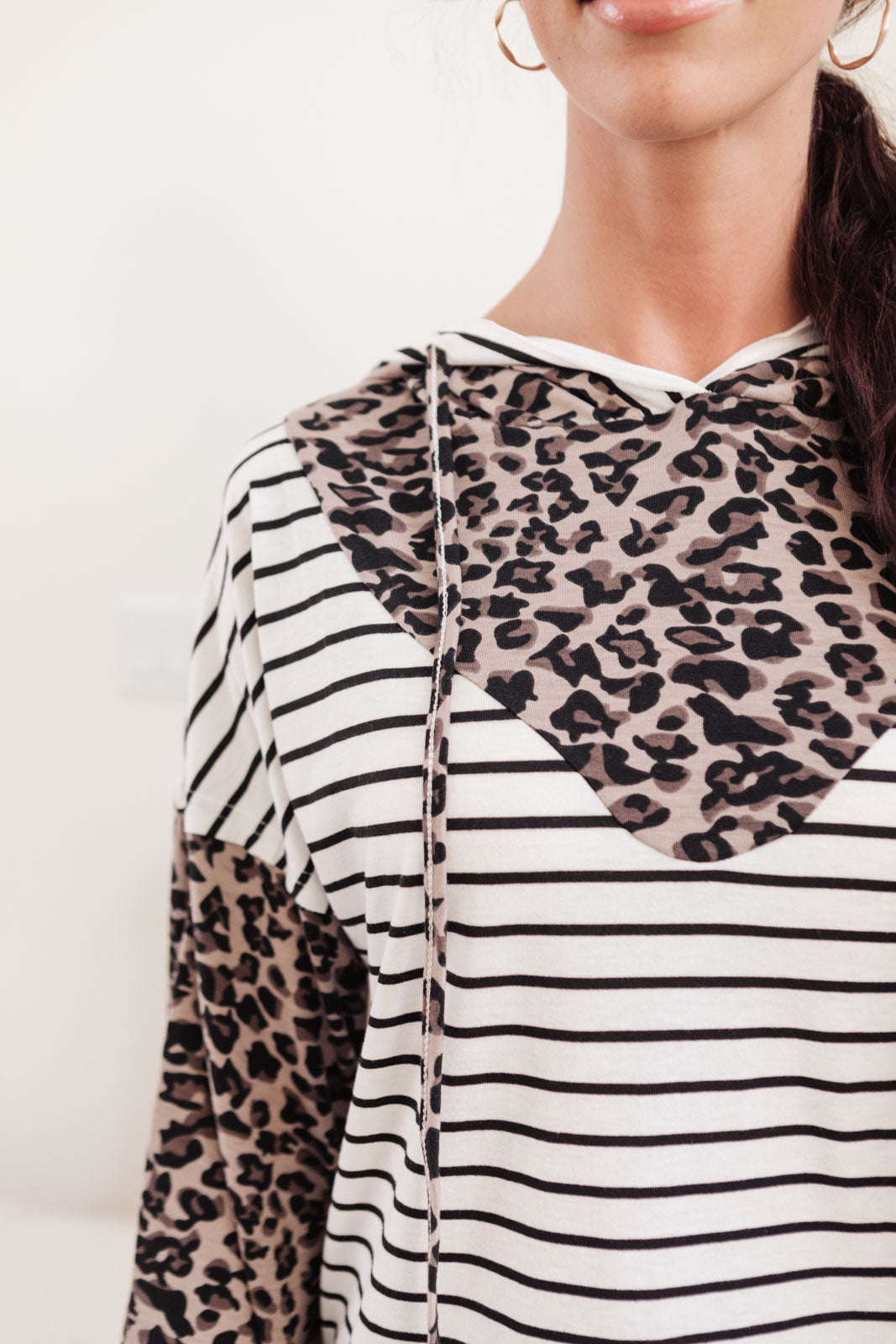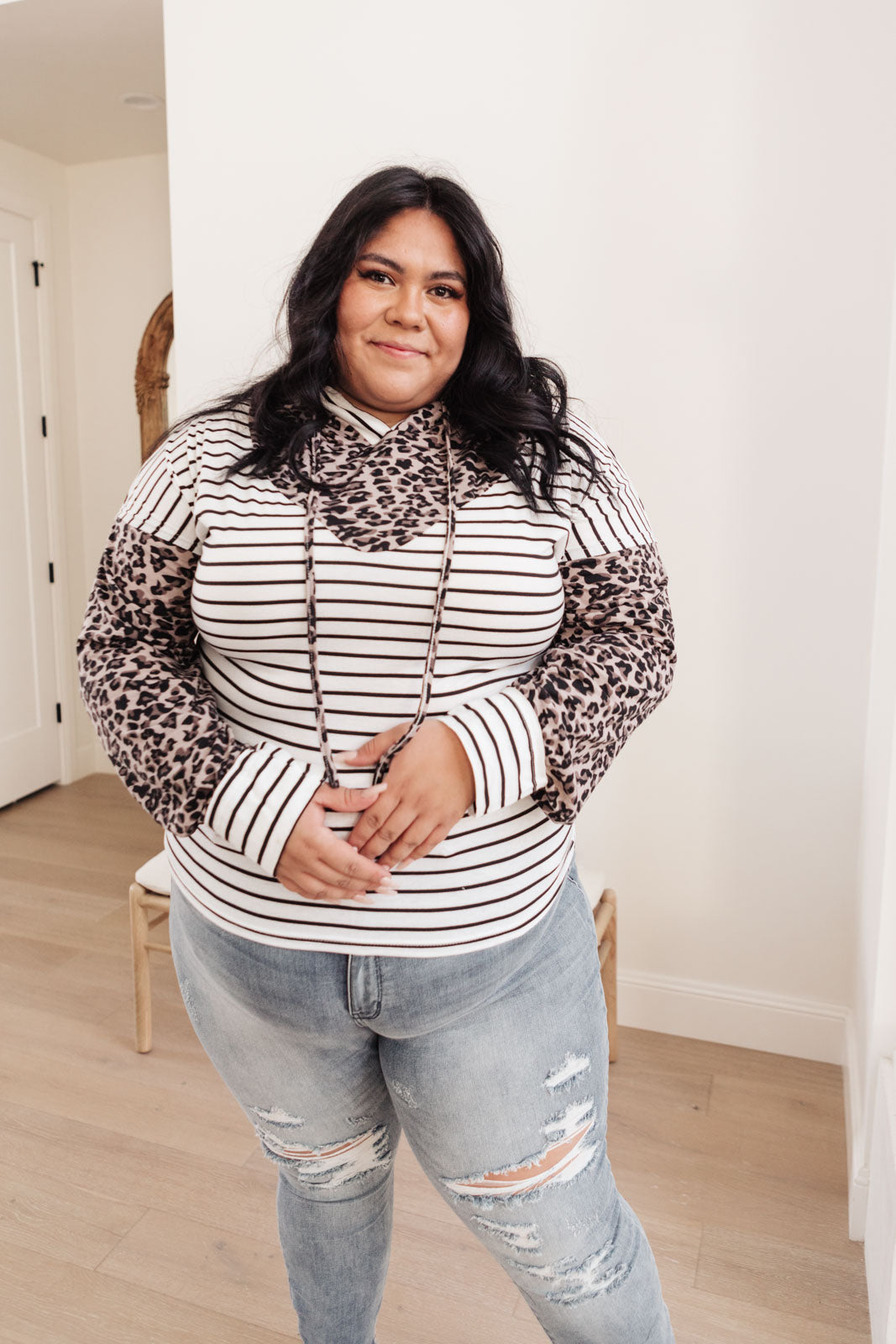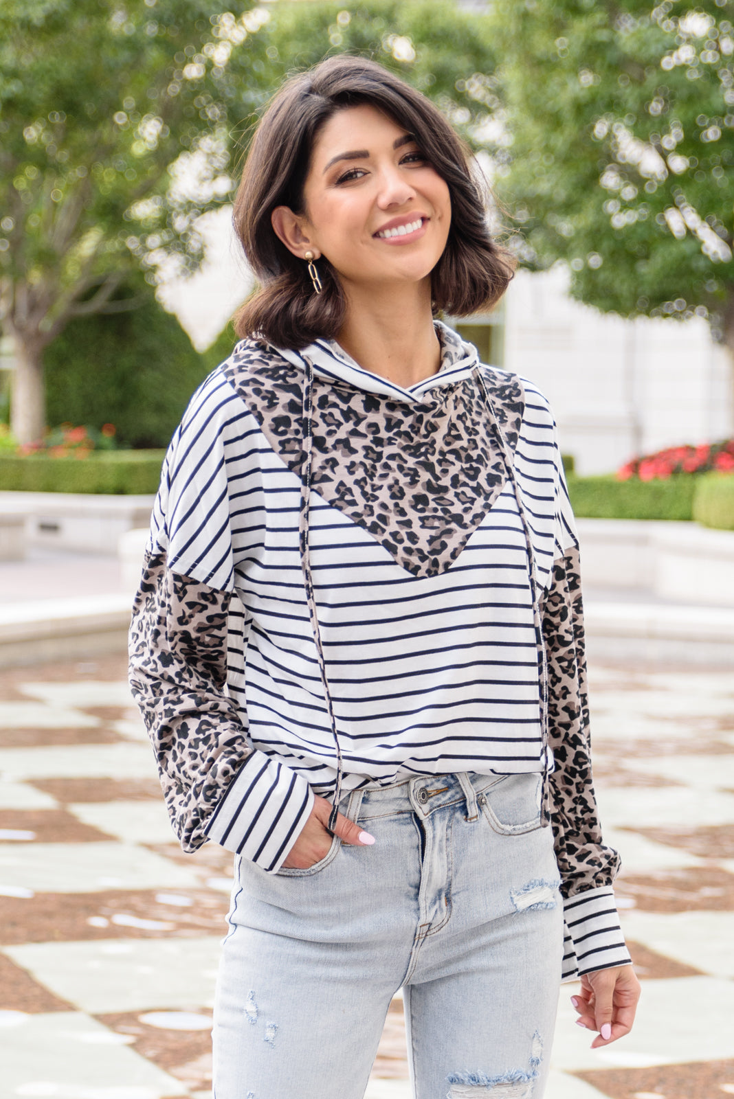 The Two Worlds Meet Hoodie will elevate your laid back look! The fun animal print and striped design come together in a hooded neckline, long sleeves and drop shoulders. Pair joggers and sneakers for a complete outfit!