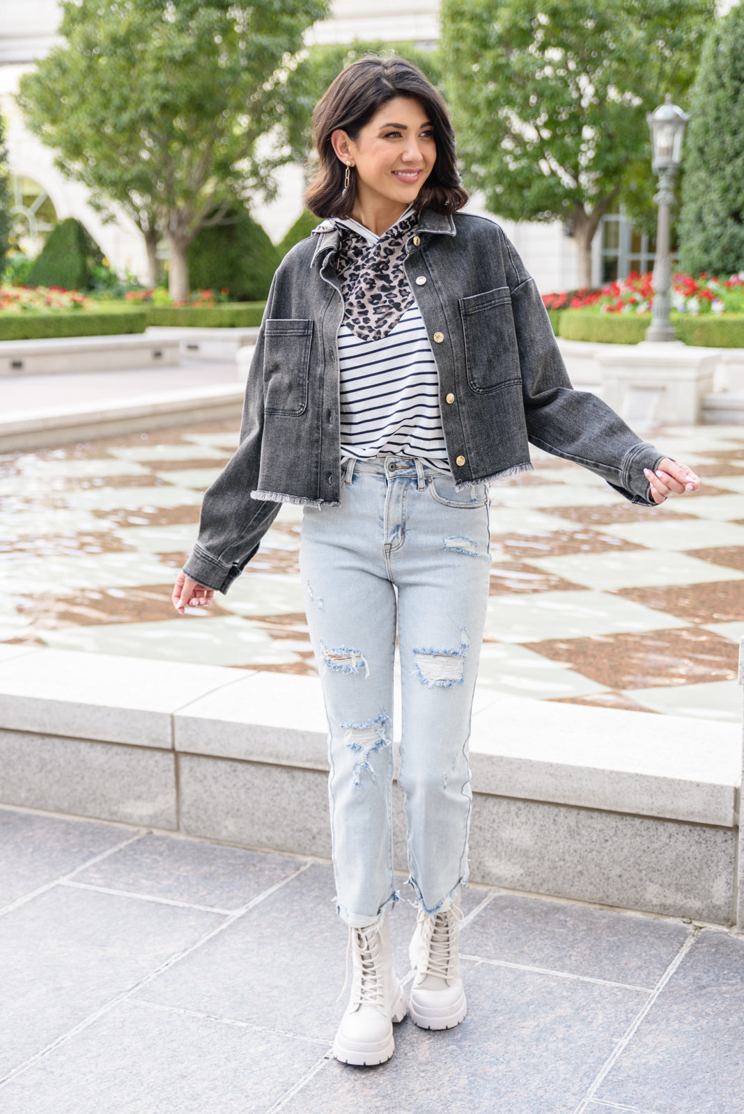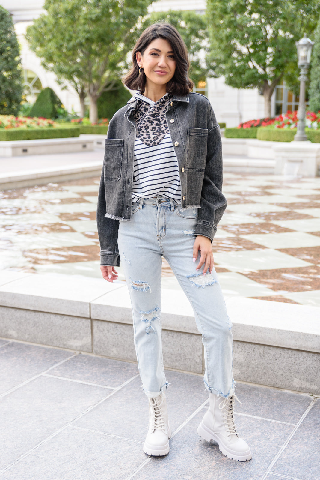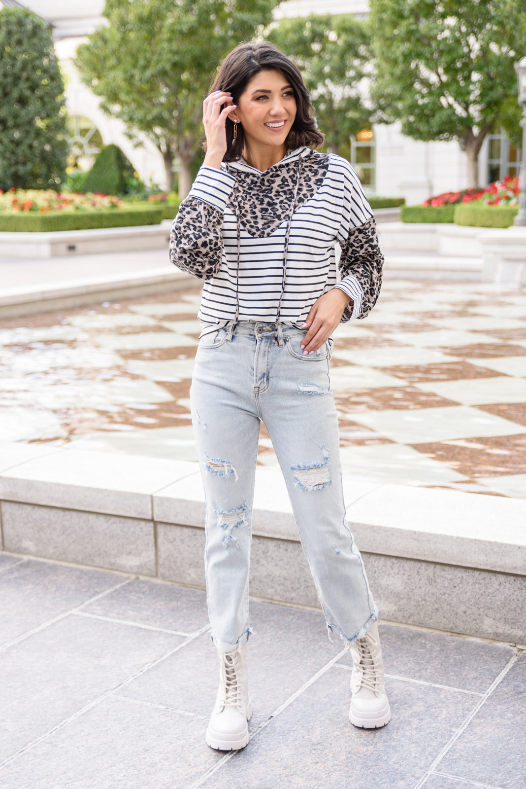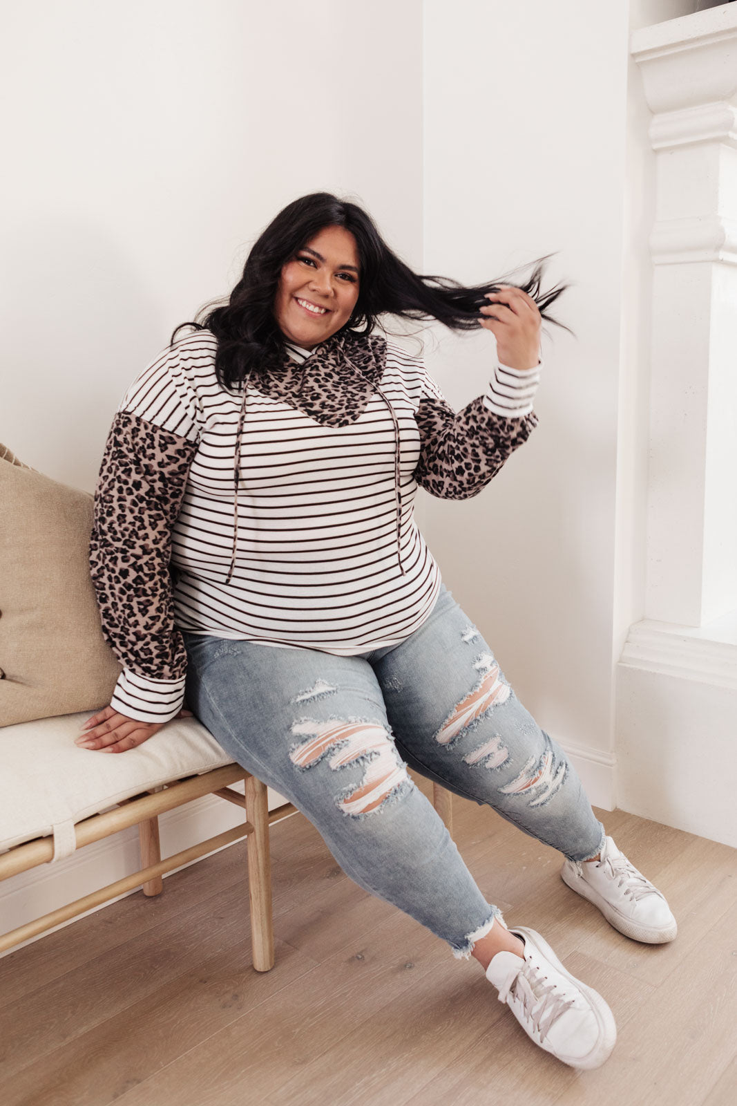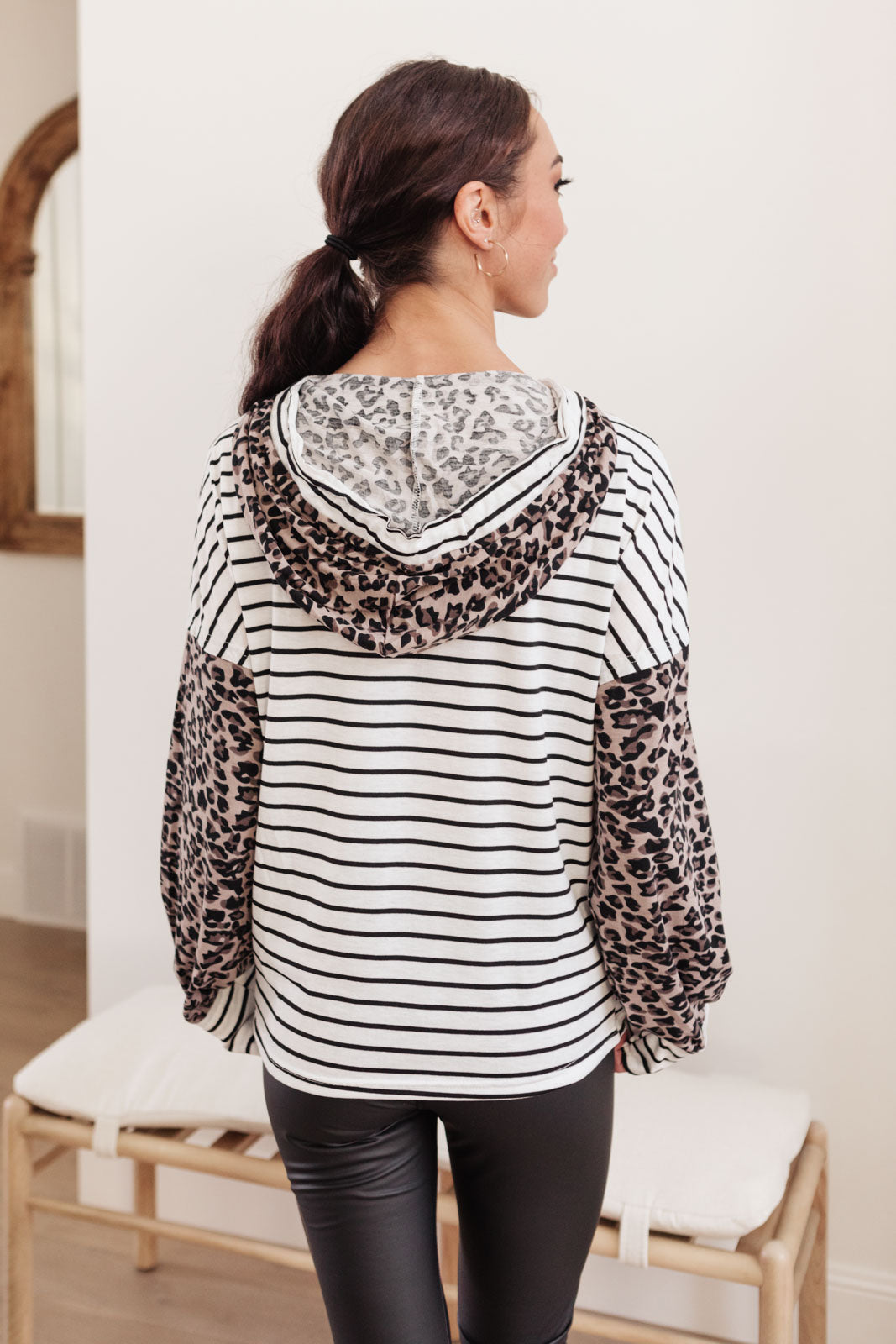 The Two Worlds Meet Hoodie will elevate your laid back look! The fun animal print and striped design come together in a hooded neckline, long sleeves and drop shoulders. Pair joggers and sneakers for a complete outfit!