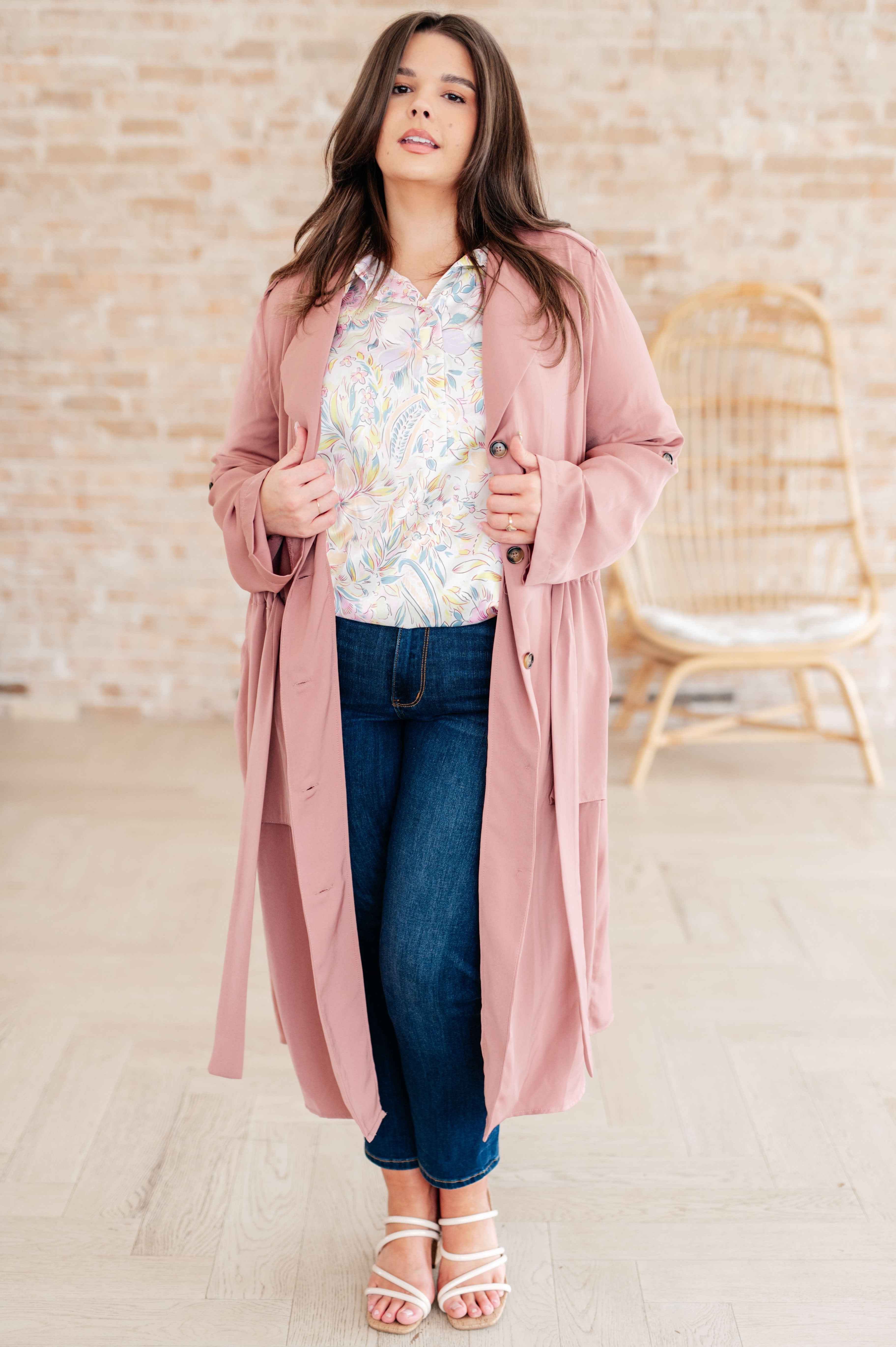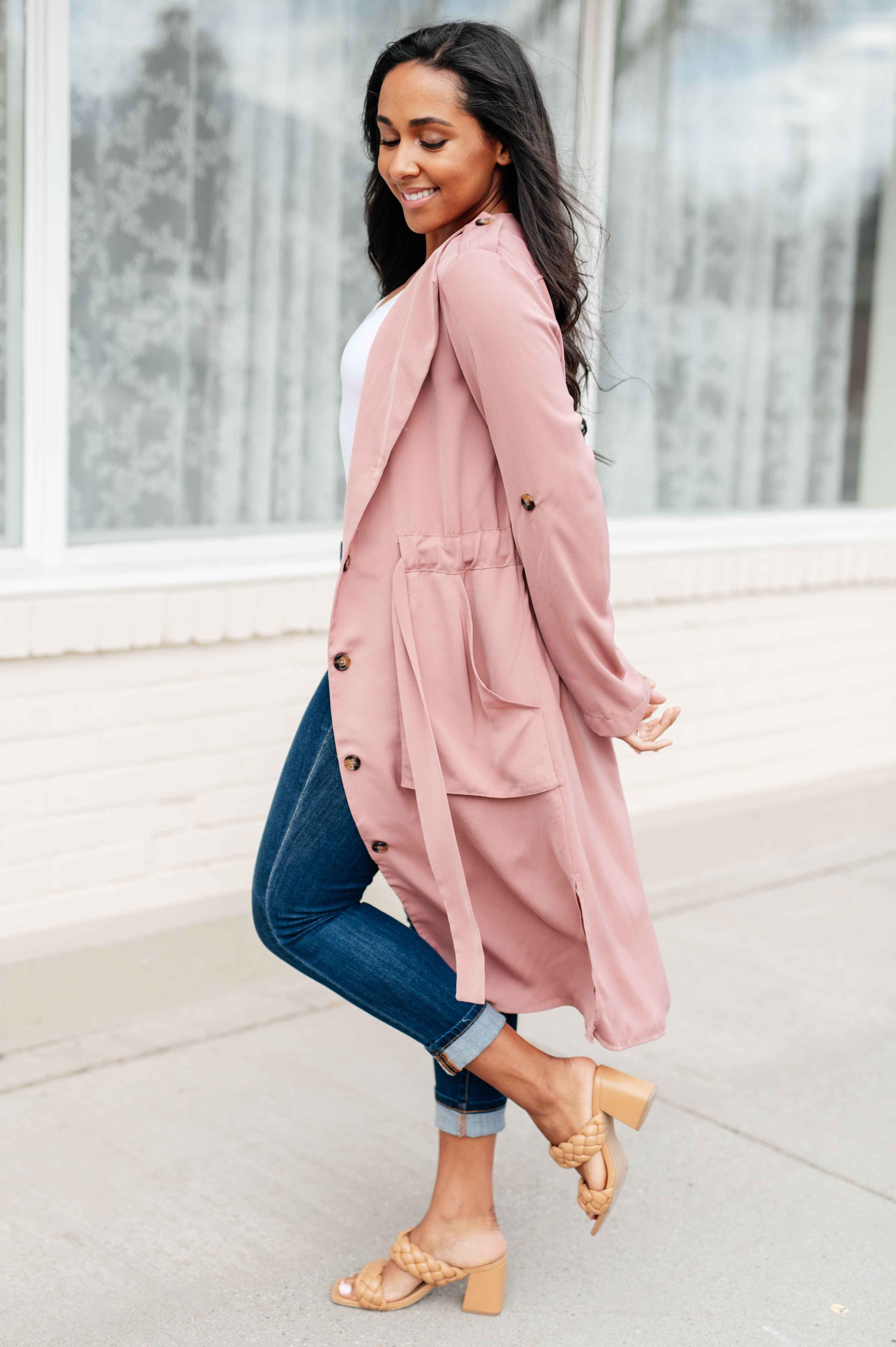 ¡Enamórate de la chaqueta First Day of Spring en malva polvoriento! ¡No solo el color es perfecto, sino también los detalles! Con cuello drapeado, botones funcionales, un bonito lazo en la cintura, bolsillos profundos, aberturas laterales y mangas con solapa enrollable. Esta chaqueta ligera combinará a la perfección con tus básicos de primavera.