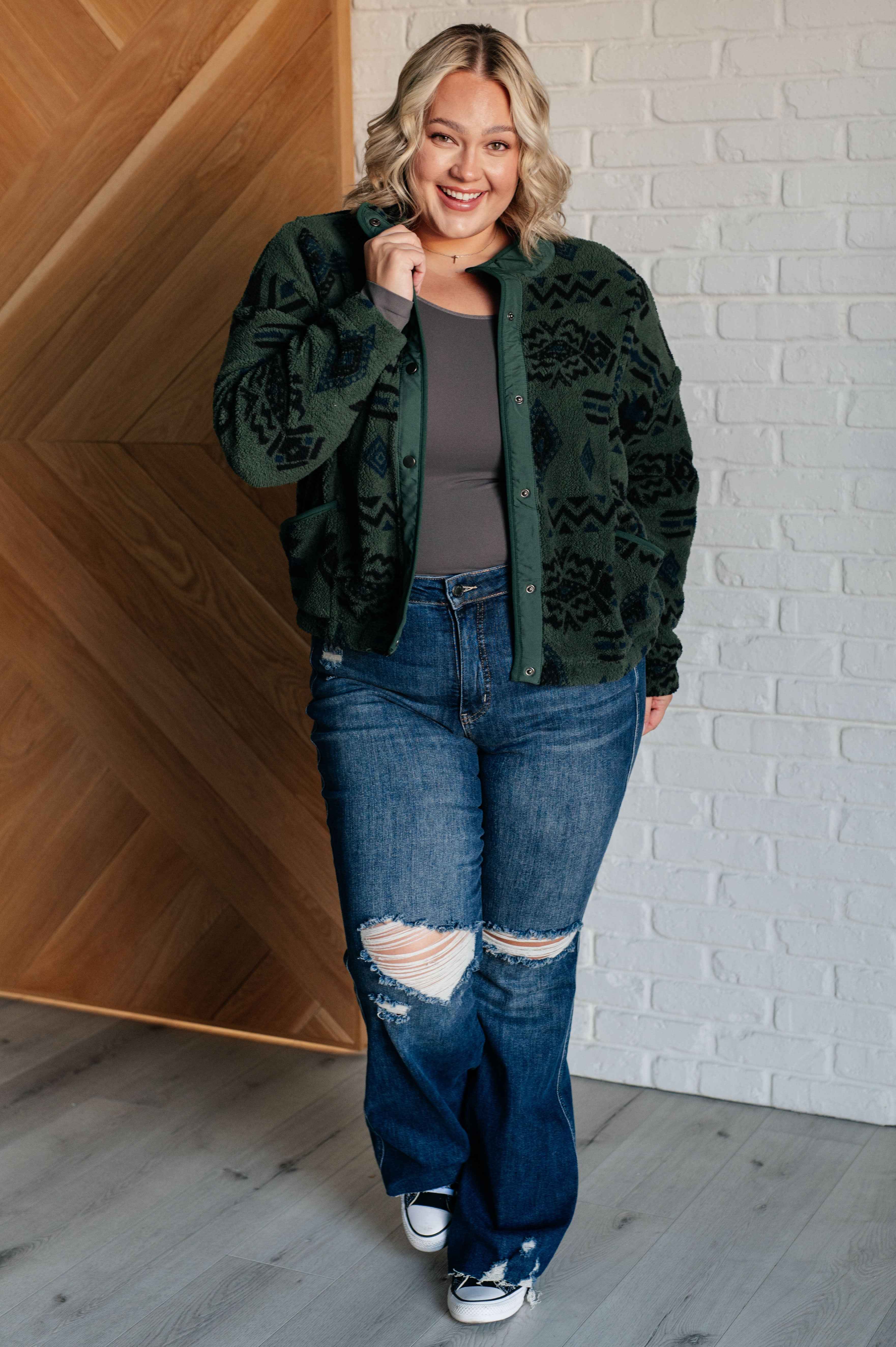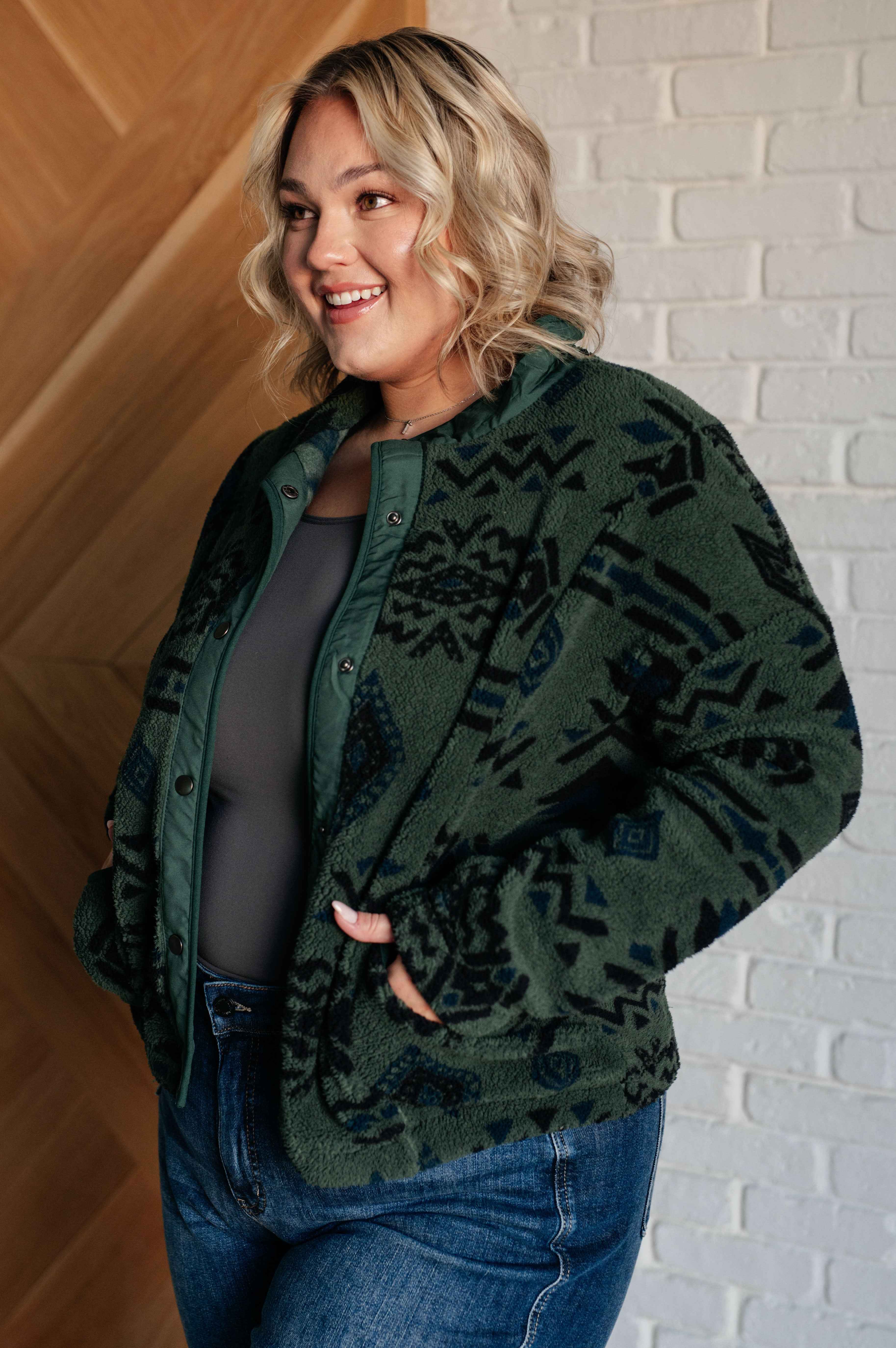 ¡Mantente abrigada y con estilo con nuestra chaqueta polar geométrica de alta calidad! Confeccionada en suave forro polar y con cierre de botones a presión, bolsillos delanteros y cuello alto, esta chaqueta te mantendrá caliente y a la moda. Las costuras contorneadas y los hombros caídos le dan un toque único al clásico estampado geométrico.