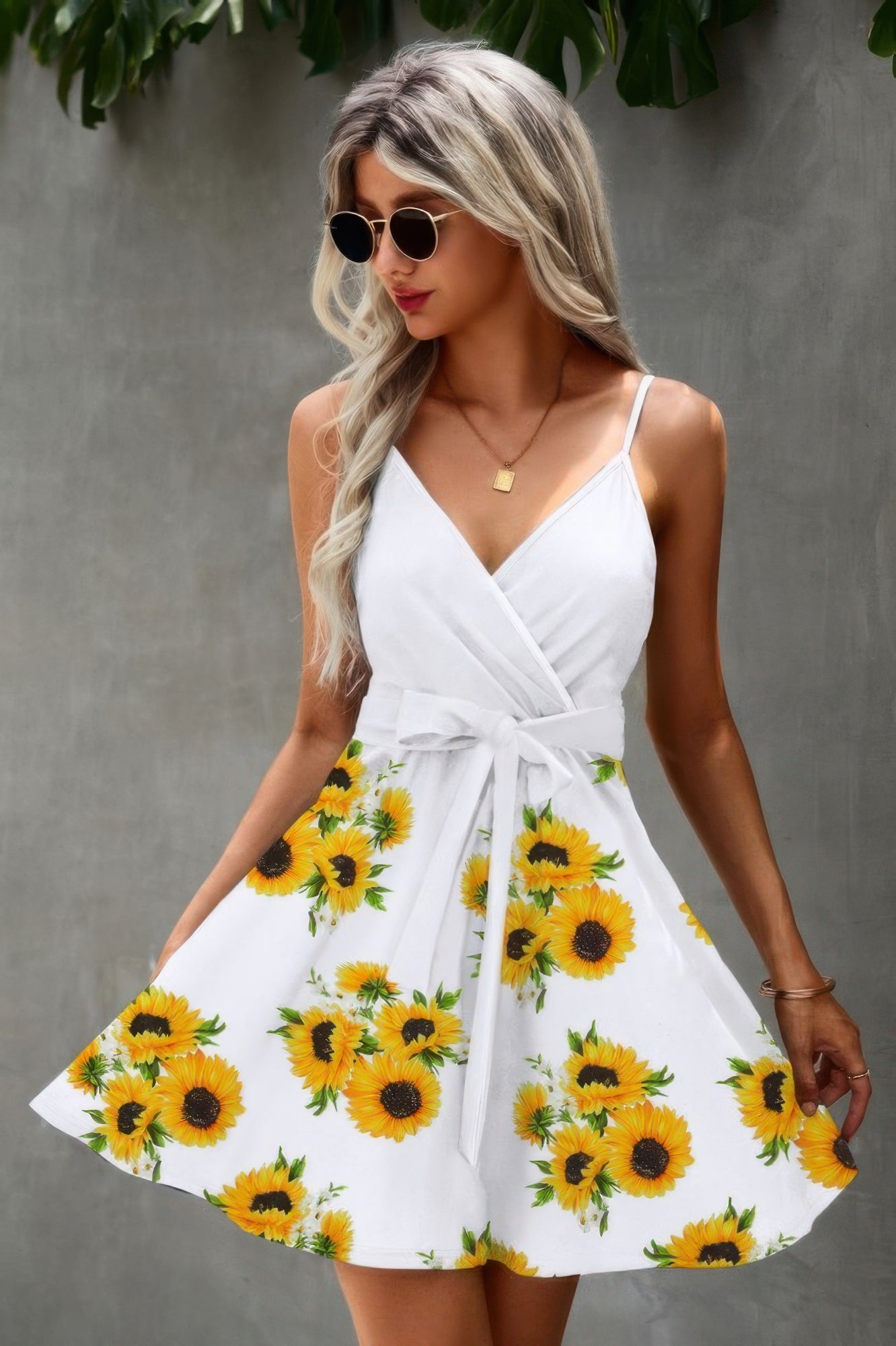 Floral V Neck Spaghetti Strap Belted Cami Dress
