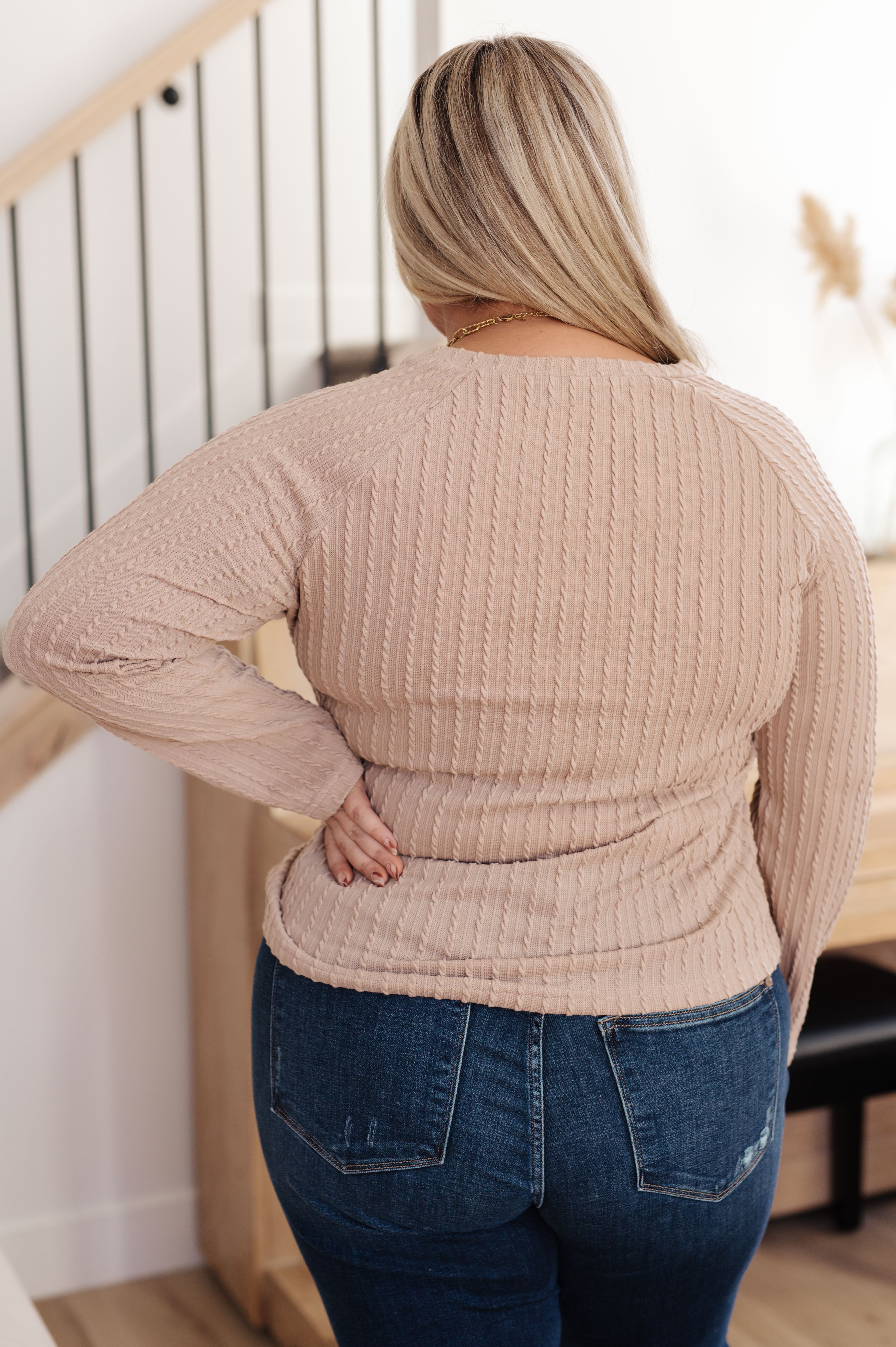 Relaja tus sentidos con este top Winding Down con detalle de cable. Su tejido texturizado, mangas raglán y cuello redondo te mantendrá cómoda y con estilo. Disfruta de la lujosa suavidad de esta prenda atemporal.