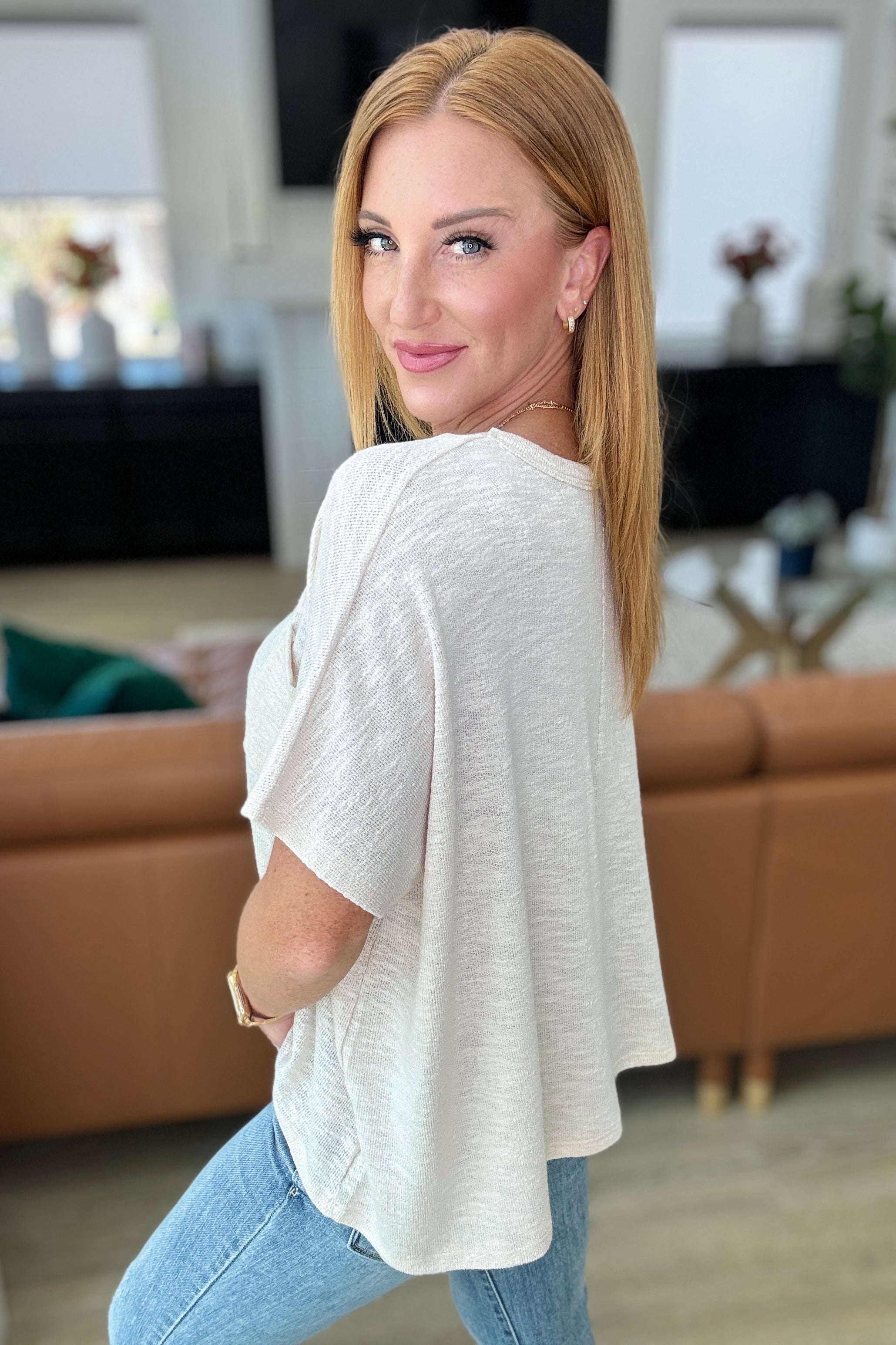 Camiseta extragrande con hombros caídos "Let Light be Light" en beige arena - S/M está agotado y se enviará tan pronto como vuelva a estar disponible.