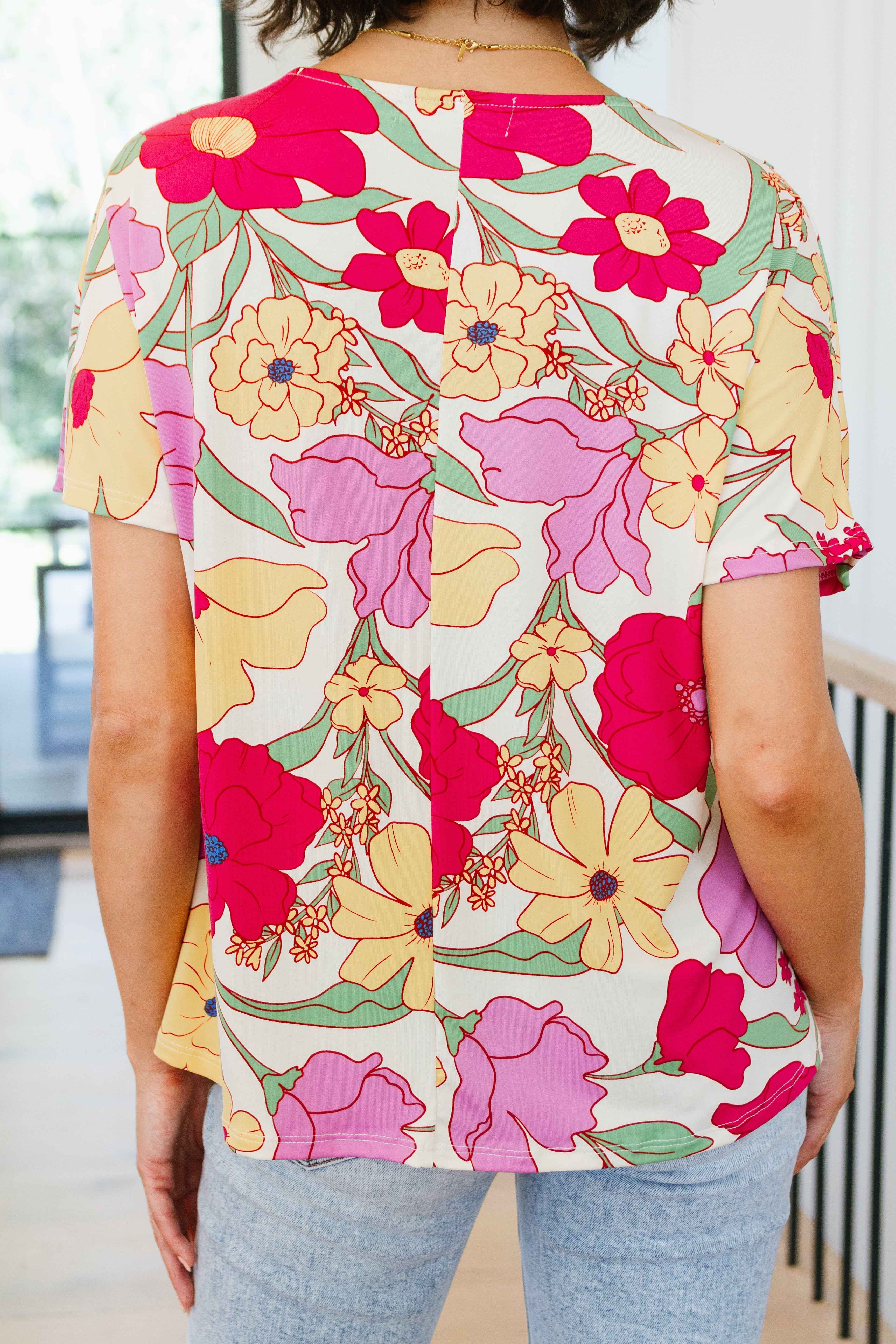 Dale un toque único a tu armario con el top floral Do It Anyways. Confeccionado con tejido Bulgari ligero y fácil de llevar, este top luce un impactante estampado floral y frunces en el busto para un ajuste favorecedor. ¡Atrae todas las miradas con su llamativo escote en V y marca tendencia allá donde vayas!