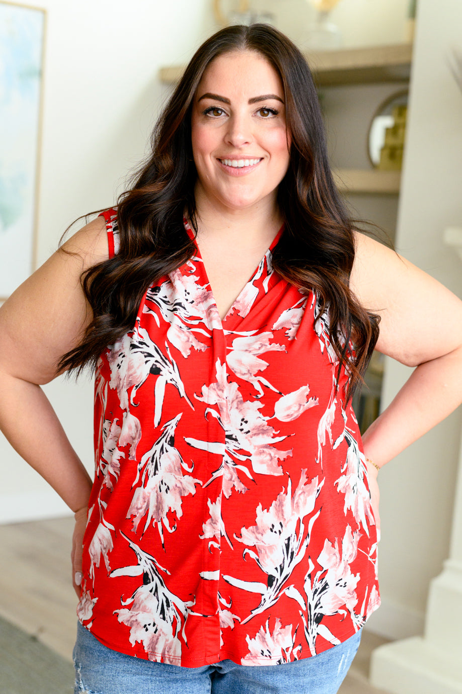 Transforma cualquier look con nuestra camiseta de cuello en V "Please Don't Stop the Music". Con un favorecedor escote en V, un elegante detalle plisado en la parte delantera y un vibrante estampado floral, esta camiseta sin mangas es perfecta para cualquier ocasión. Dale un toque de color y sofisticación a tu armario que llamará la atención y te hará sentir segura y con estilo.