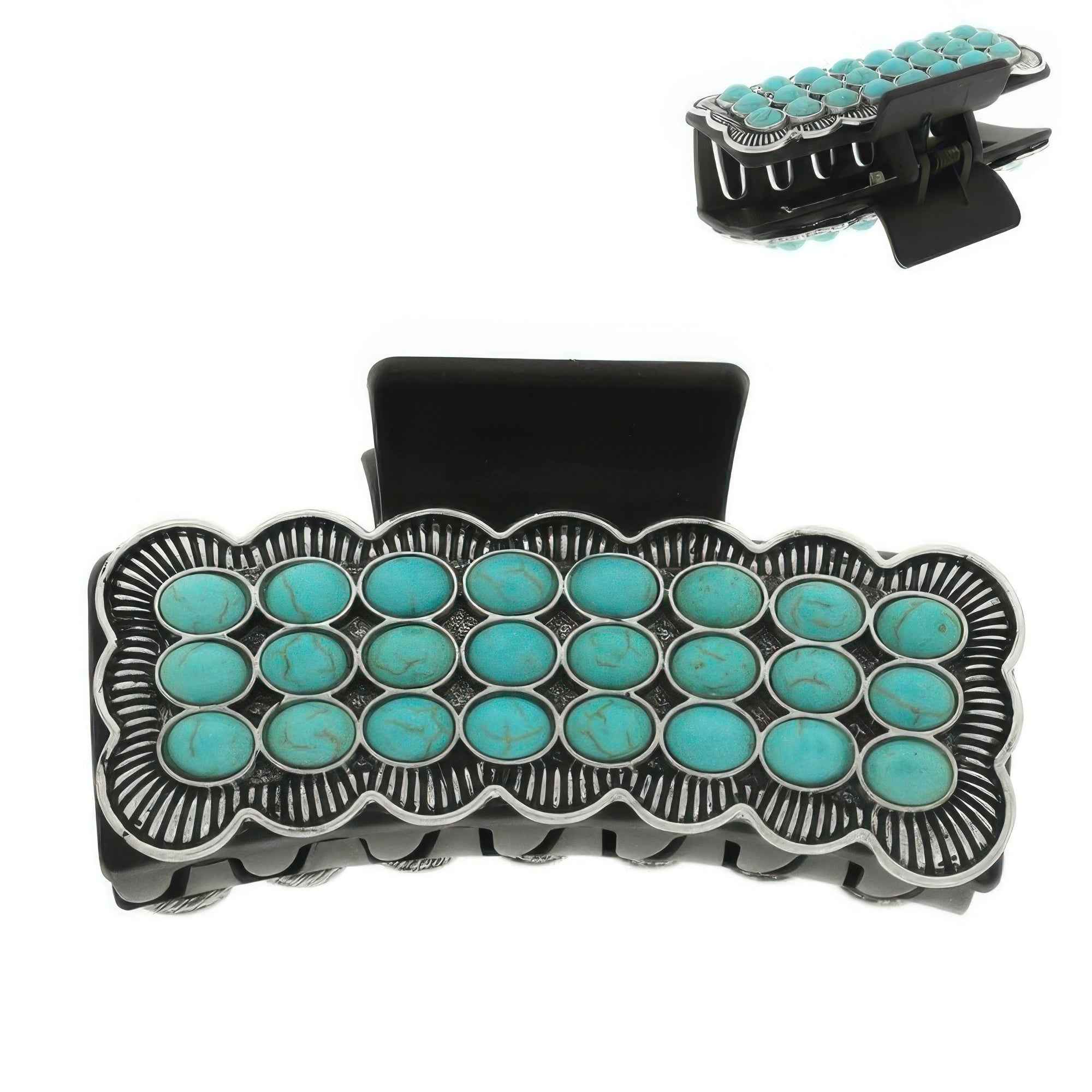 Bring a bold Western touch to your hair styling with this turquoise bubble pave hair claw clip. Crafted in oxidized silver-tone metal, it offers a rustic yet glam aesthetic perfect for everyday wear or standout event looks. The decorative design and sturdy construction provide a strong grip while remaining lightweight and practical. Whether you're heading to a rodeo, concert, or barn party, this clip is a stylish nod to Southwest charm. Its vibrant turquoise detailing adds a bohemian flair that complements both casual and statement outfits. Ideal for festival-goers, country lovers, and cowgirl-chic fans alike.